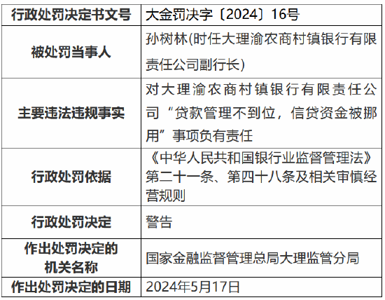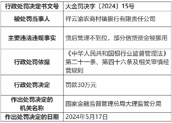 6月3日金融一线音书,国度金融监督处置总局大理监管分局行政处罚信息公开表透露,祥云渝农商村镇银行有限连累公司贷后处置不到位,部分信贷资金被挪用被罚金30万元。