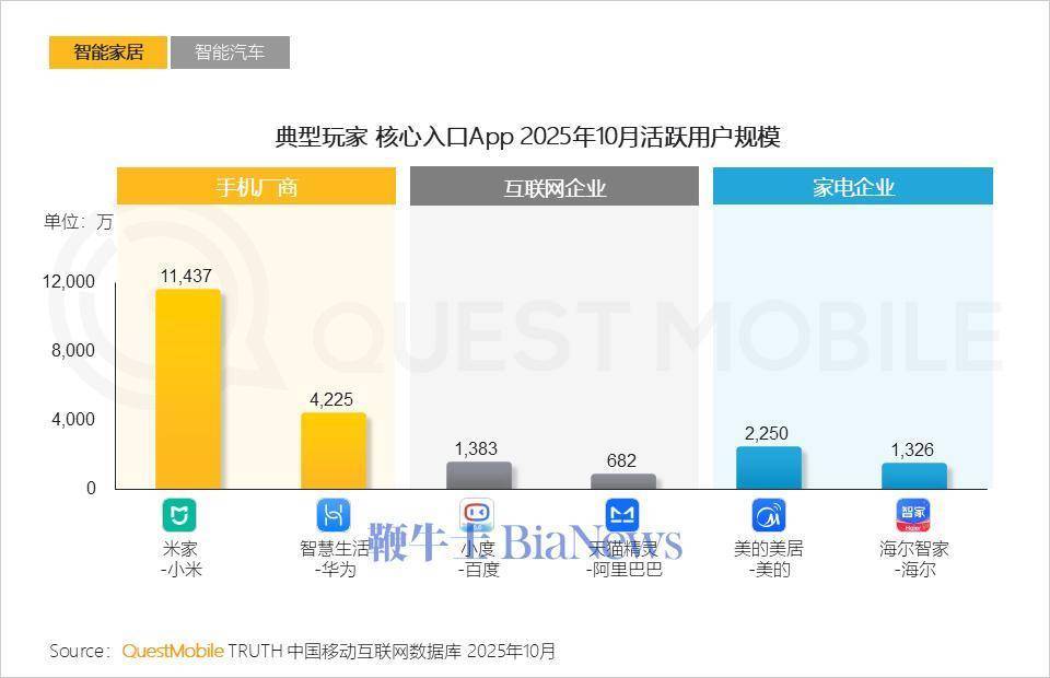 智能家居方面,2025年10月智能家居类App用户范围达3.83亿,月东说念主均使用次数60.7次,同比分袂增长14.3%、8.0%。从10月份月活用户范围来看,小米米家月活1.14亿,华为聪慧活命月活4225万,百度小度智能音箱月活1383万、阿里巴巴天猫精灵智能音箱月活682万,好意思的好意思居月活2250万、海尔智家月活1326万。