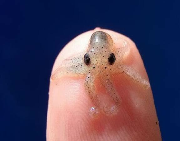 这是一只章鱼宝宝,半透明的躯壳静静地趴在手指上,两颗玄色的眼睛嵌在脑袋双方,看着相称呆萌!