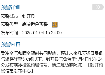 县场所局推断,本周我县保管干燥天气,日夜温差大。9日起受新一股冷空气补充影响,日平均气温将下落4~6℃;10到12日清晨,我县有5℃及以下低顺心霜(冰)冻(高海拔山区0℃傍边);推断13到14日,晴冷干燥天气握续。