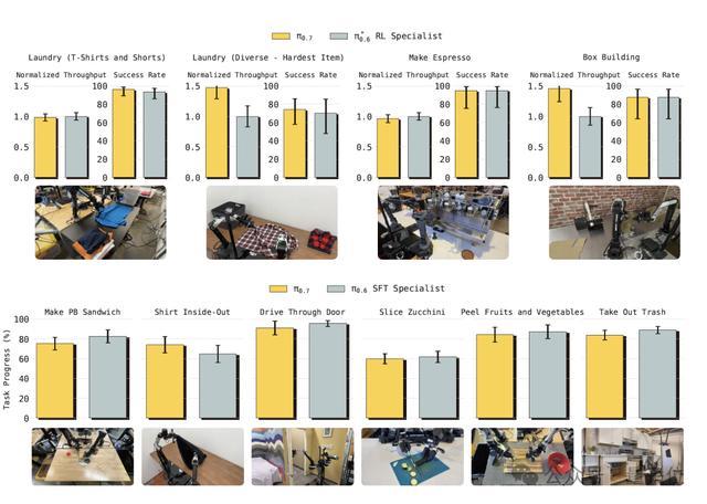 这里说的大众模子有两种,一种是π*0.6的RL specialist,用RECAP措施针对咖啡、装箱、叠穿戴单独训过。