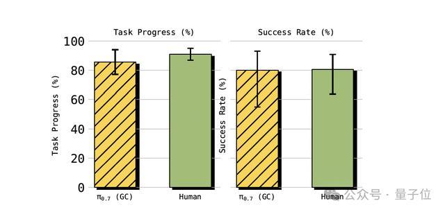 π0.7不但作念出来了,任务完成度85.6%,和10个平均375小时teleoperation劝诫的顶级东谈主类操作员的90.9%基本打平。