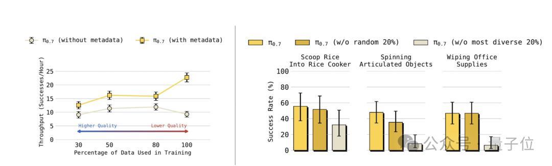 然后区别训两个版块的π0.7,一个加metadata(每条数据打上质地几分、有莫得出错、多快完成的标签),一个不加。