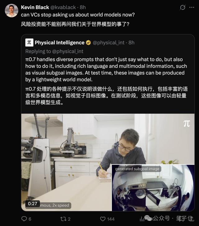 说到这里,可能有东谈主会问,π0.7里塞了个world model,这算不算和全国模子派会通了?