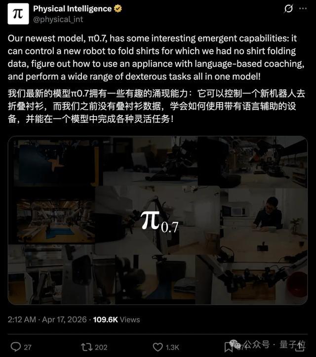 今天凌晨,Physical Intelligence发布了全新的VLA模子π0.7,狠狠敲了全国模子一记闷棍。