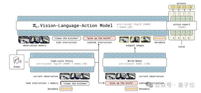 此外,π0.7还站在两篇前作的肩膀上,采纳了π0.6的架构基础底细,以及MEM的多模范牵记编码器(短期视频memory+永恒语义memory)。