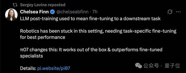 π0.7改变了这少量:开箱即用,并且跨越了fine-tuned的大众模子。