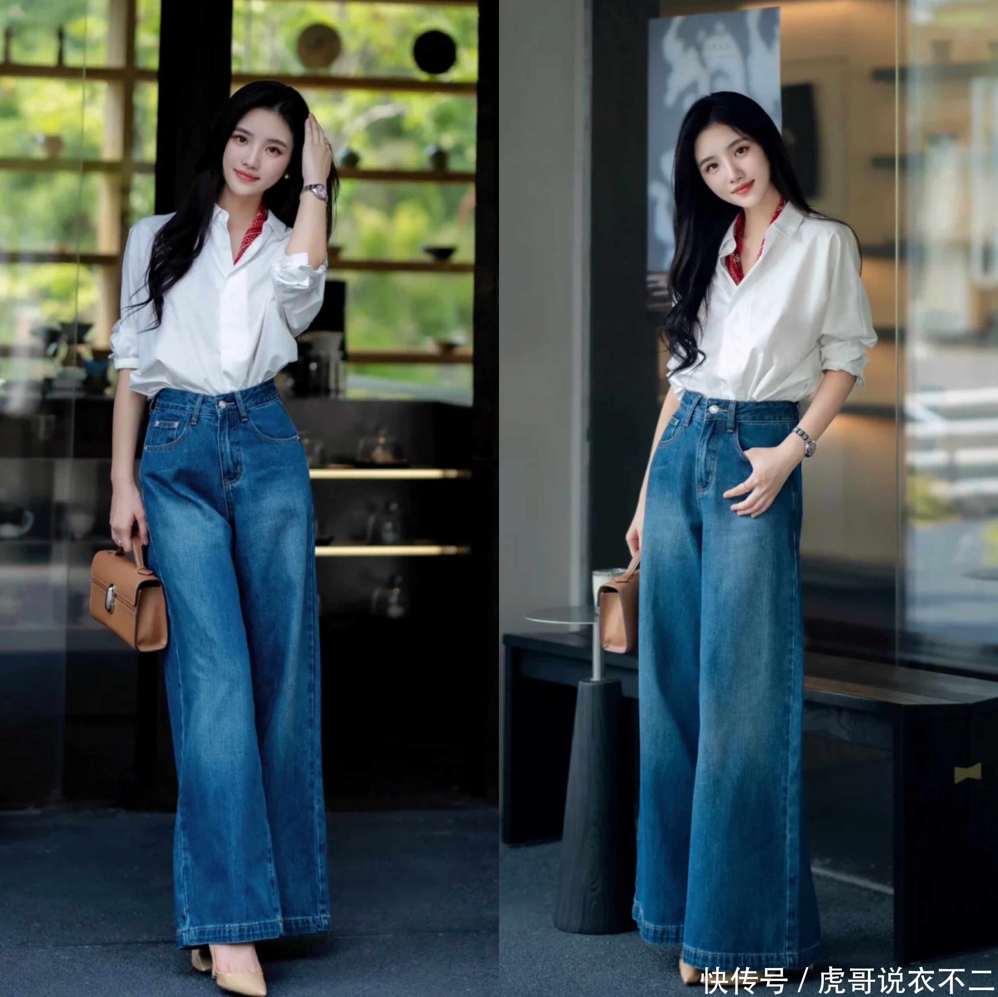 衬衫+牛仔阔腿裤:比拟T恤的失业自得,好的衬衫+阔腿裤则更显高档,纯白色的衬衫搭配蓝色高腰阔腿裤,将下摆塞进裤腰,打造优雅高档的通勤风穿搭。