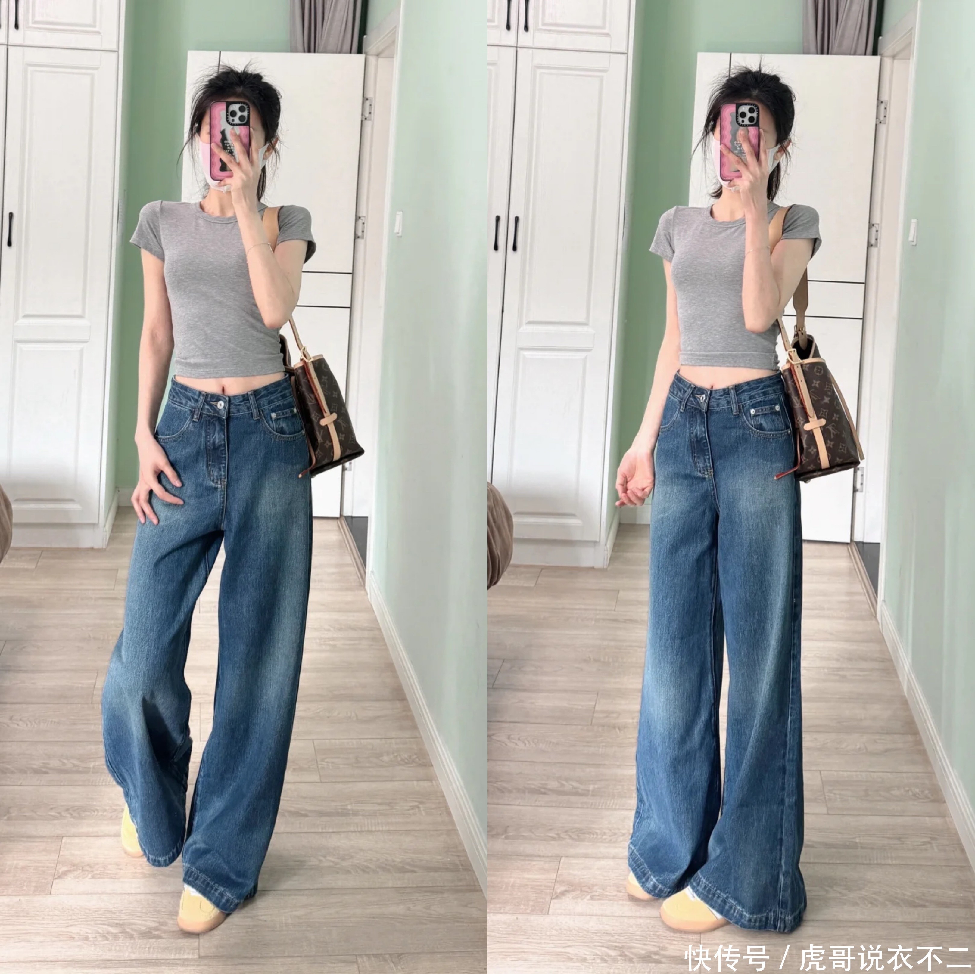 四、牛仔阔腿裤比拟其他的牛仔裤神志,近几年阔腿裤的受接待进度一直居高不下,毕竟大廓形的裤腿缱绻藏肉成确切的太好了,尤其在夏天,比拟其他版型,阔腿裤愈加阴寒自得。